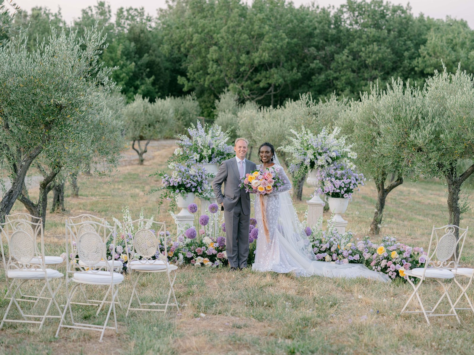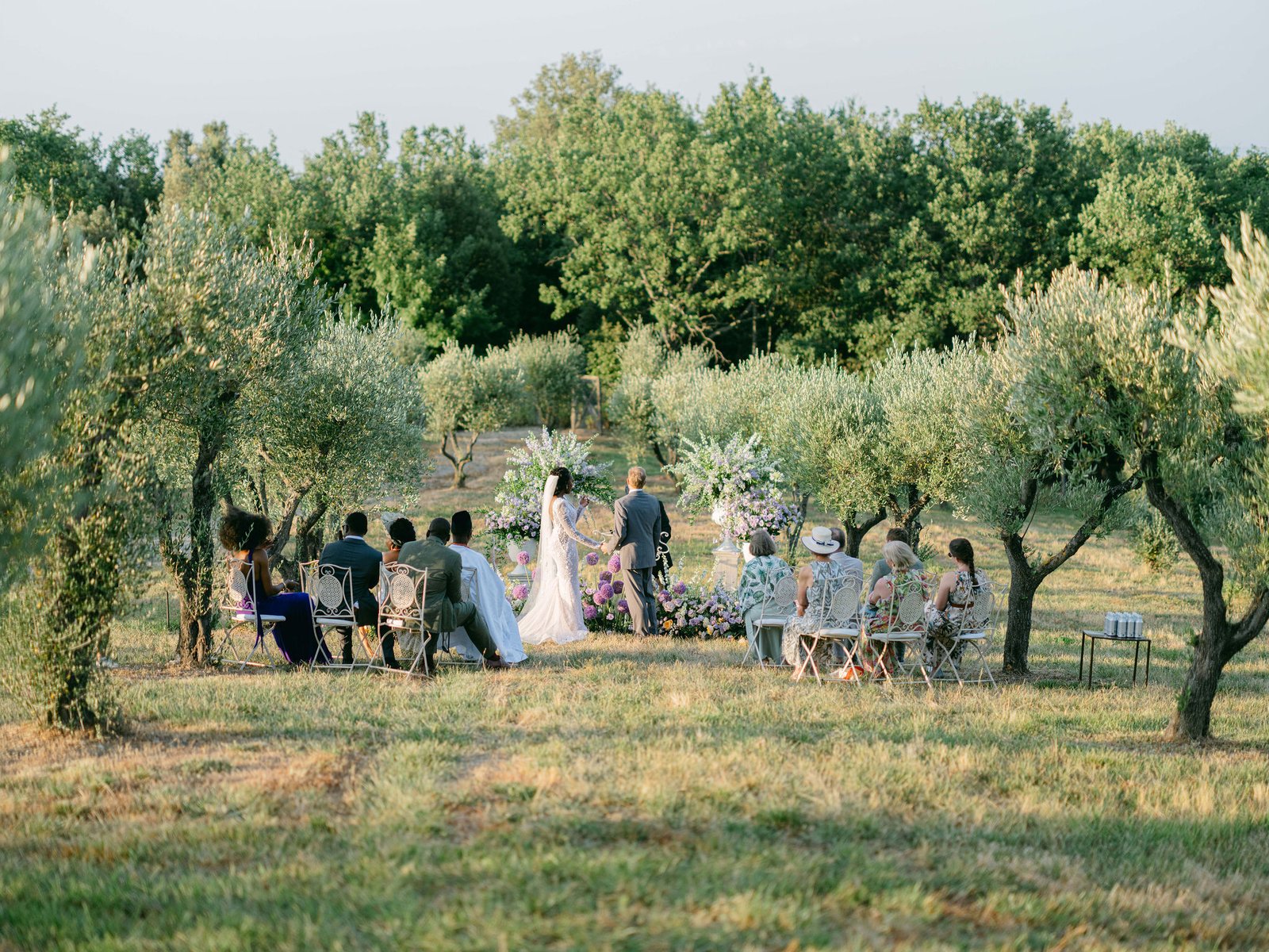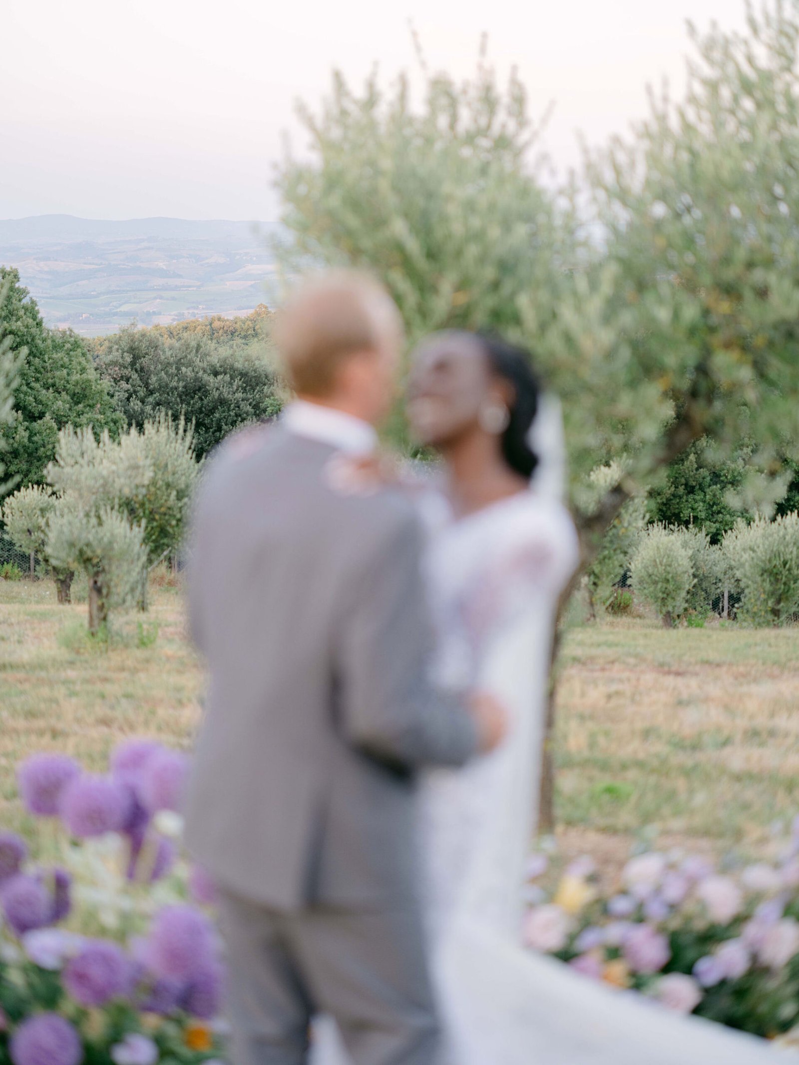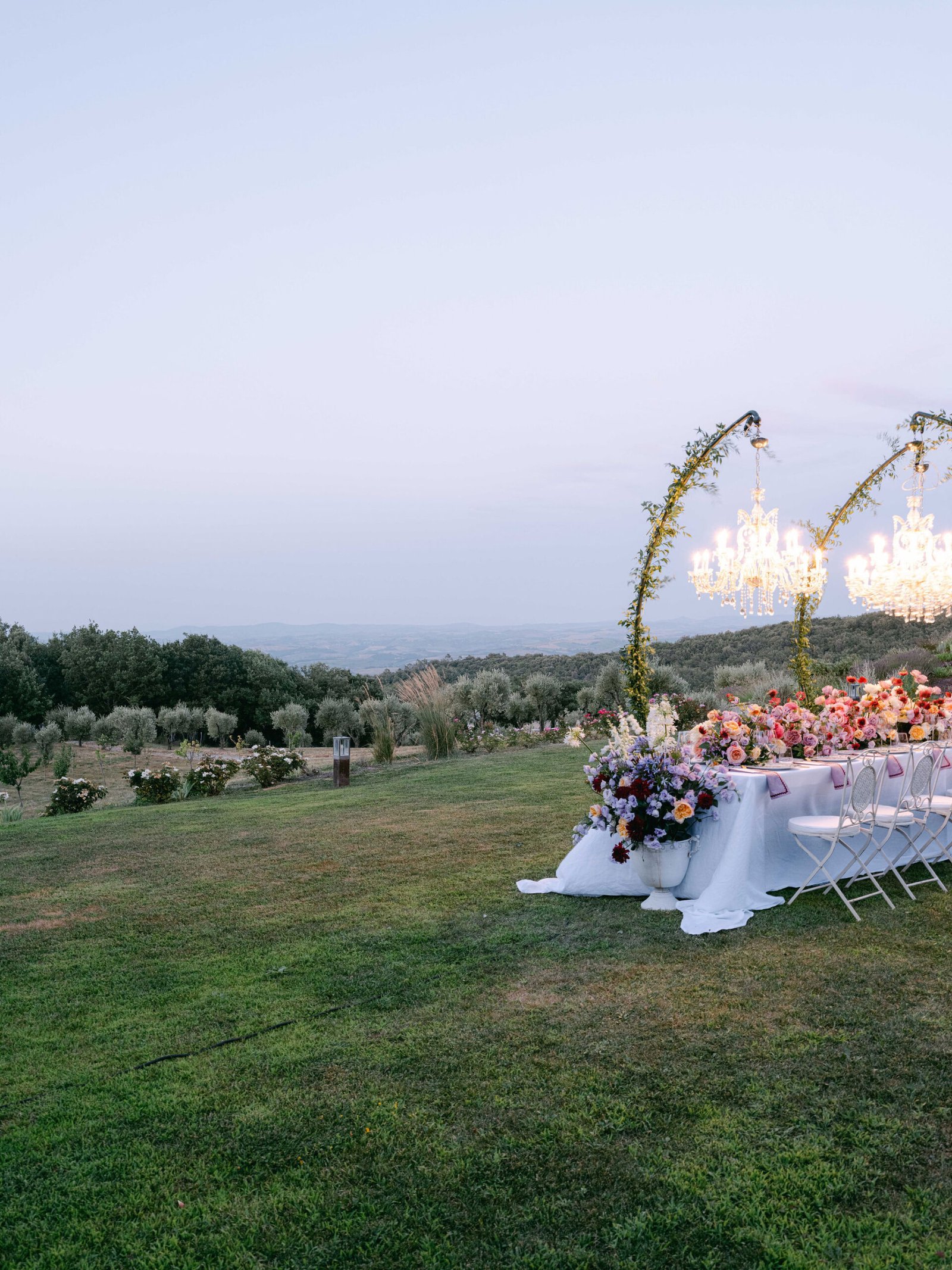 Set within the rolling hills of Montalcino, Castiglione del Bosco offered a celebration woven into the very fabric of Tuscany. Purple florals along olive grove aisles, chandeliers suspended beneath open skies, and golden hour light that only Italy can deliver.